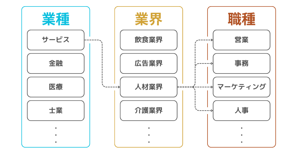 ちなみに、業種とは企業のビジネス領域を指し、職種とは個人が担当する仕事内容のことです。